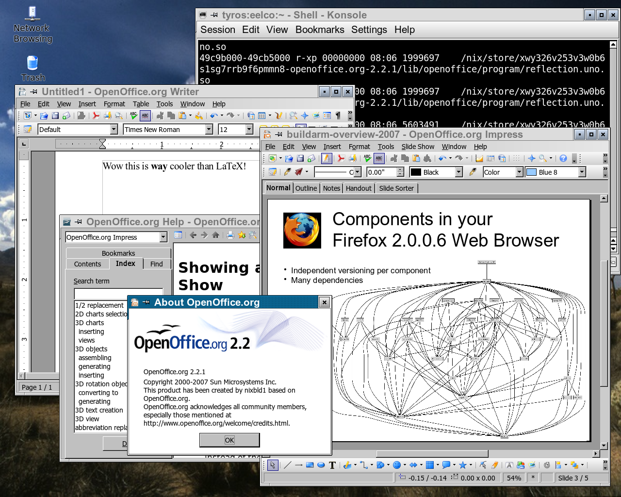 OpenOffice screenshot OpenOffice is now in Nixpkgs (screenshot of OpenOffice 2.2.1 running under NixOS, and another screenshot). Despite being a rather gigantic package (it takes two hours to compile on an Intel Core 2 6700), OpenOffice had only two “impurities” (references to paths outside of the Nix store) in its build process that had to be resolved — a reference to /bin/bash and one to /usr/lib/libjpeg.so.